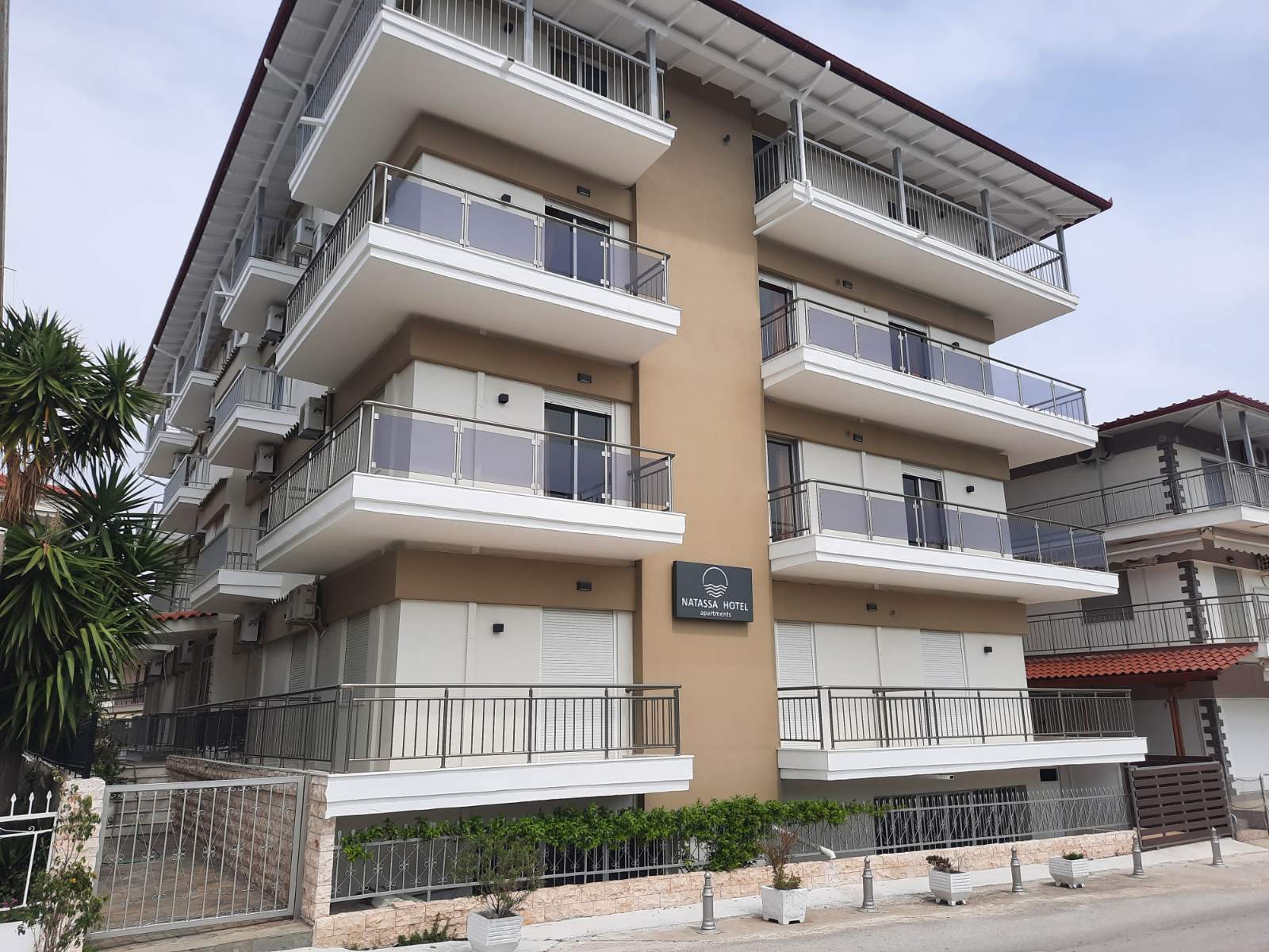Вила Наташа се наоѓа во близина на центарот на Ханиоти, на околу 80 метри од плажата. Вилата располага со студија, апартмани и дуплекс апартмани кои се наоѓаат на втор и трет кат. Сите соби располагаат со комплет опремени кујни, бања, ТВ, Wi-Fi, клима и пешкири. Има лифт, а спроти вилата има јавен паркинг.